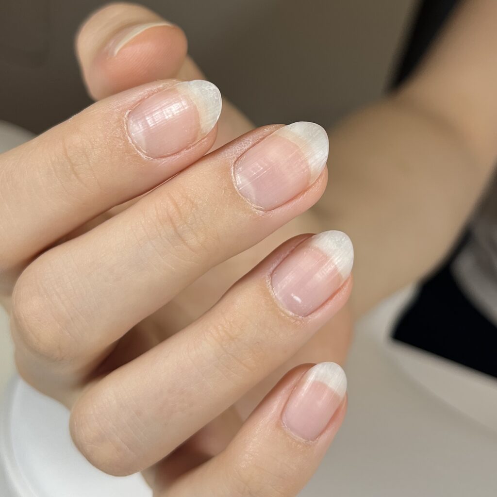 Im Studio begegnen mir häufig Fremdmodellagen mit verfeilten Seitenlinien, die die Nägel instabil und unattraktiv erscheinen lassen. Mit Sorgfalt entferne ich das Produkt, korrigiere die Nagelform und kreiere einen natürlichen Nude-Look. Das Ergebnis sind elegante, stabile und glatte Nägel, die nahezu unsichtbar herauswachsen. Lästiges Hängenbleiben oder das Verfangen von Haaren gehören der Vergangenheit an.
