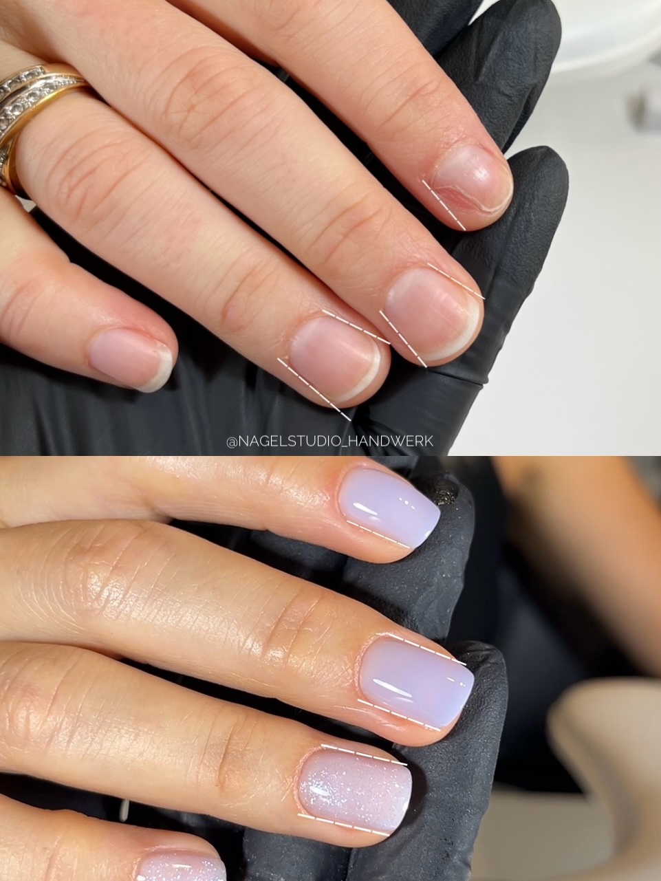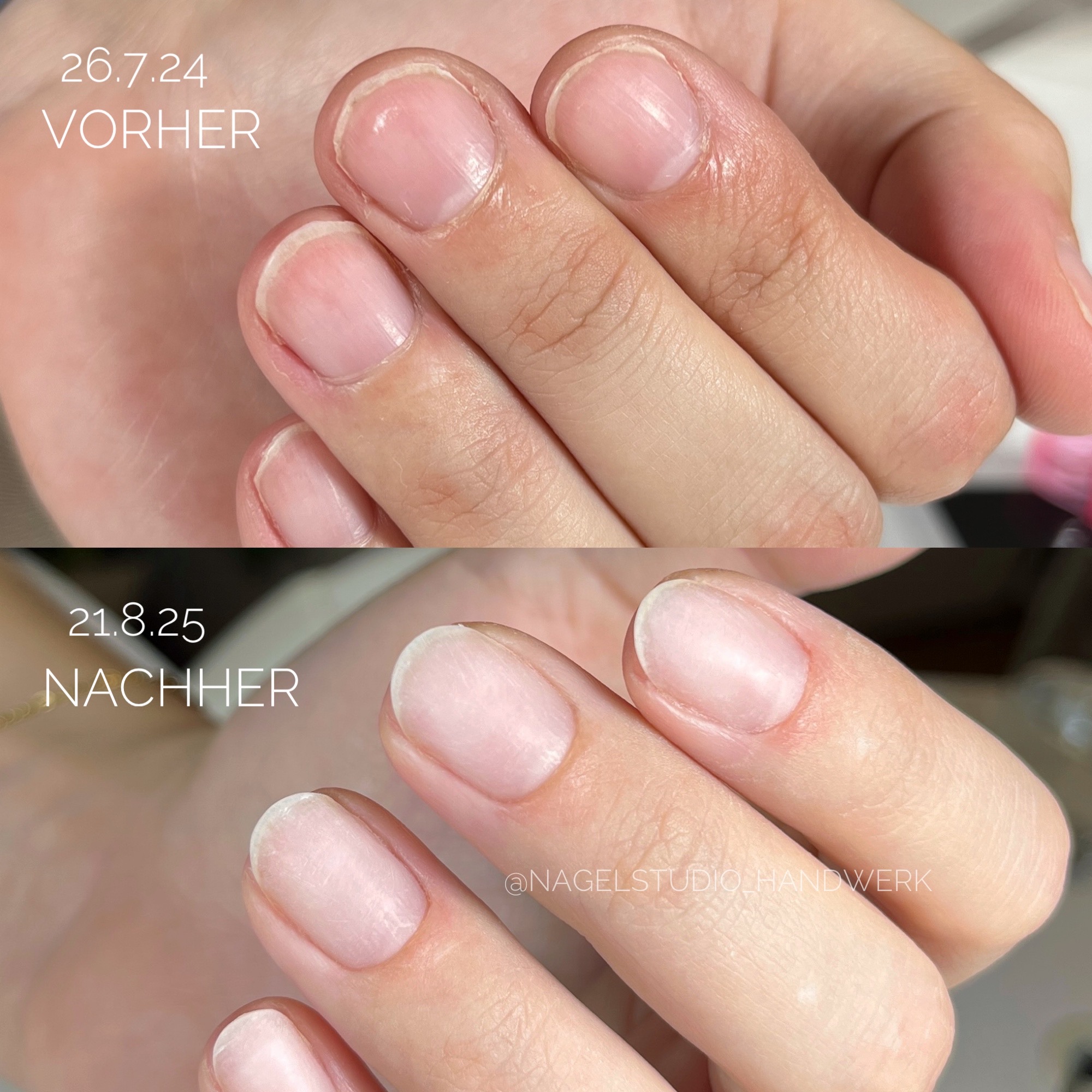 Die Nageltransformation (Umgestaltung der Nagelform) ist ein präziser, handwerklicher Prozess. Ausgangspunkt sind häufig breite, trapezförmige Nägel mit einem kurzen Nagelbett. Die Modellage fokussiert darauf, die Seitenlinien parallel zu formen und das Nagelbett zu verlängern. Das Ergebnis zeigt die Wirksamkeit fachgerechter Techniken – ein harmonischeres Gesamtbild, das die Fingernägel femininer wirken lässt. Die Transformation demonstriert, wie gezielte Formgebung nicht nur das Erscheinungsbild der Nägel, sondern auch den Gesamteindruck der Hände maßgeblich beeinflussen kann.