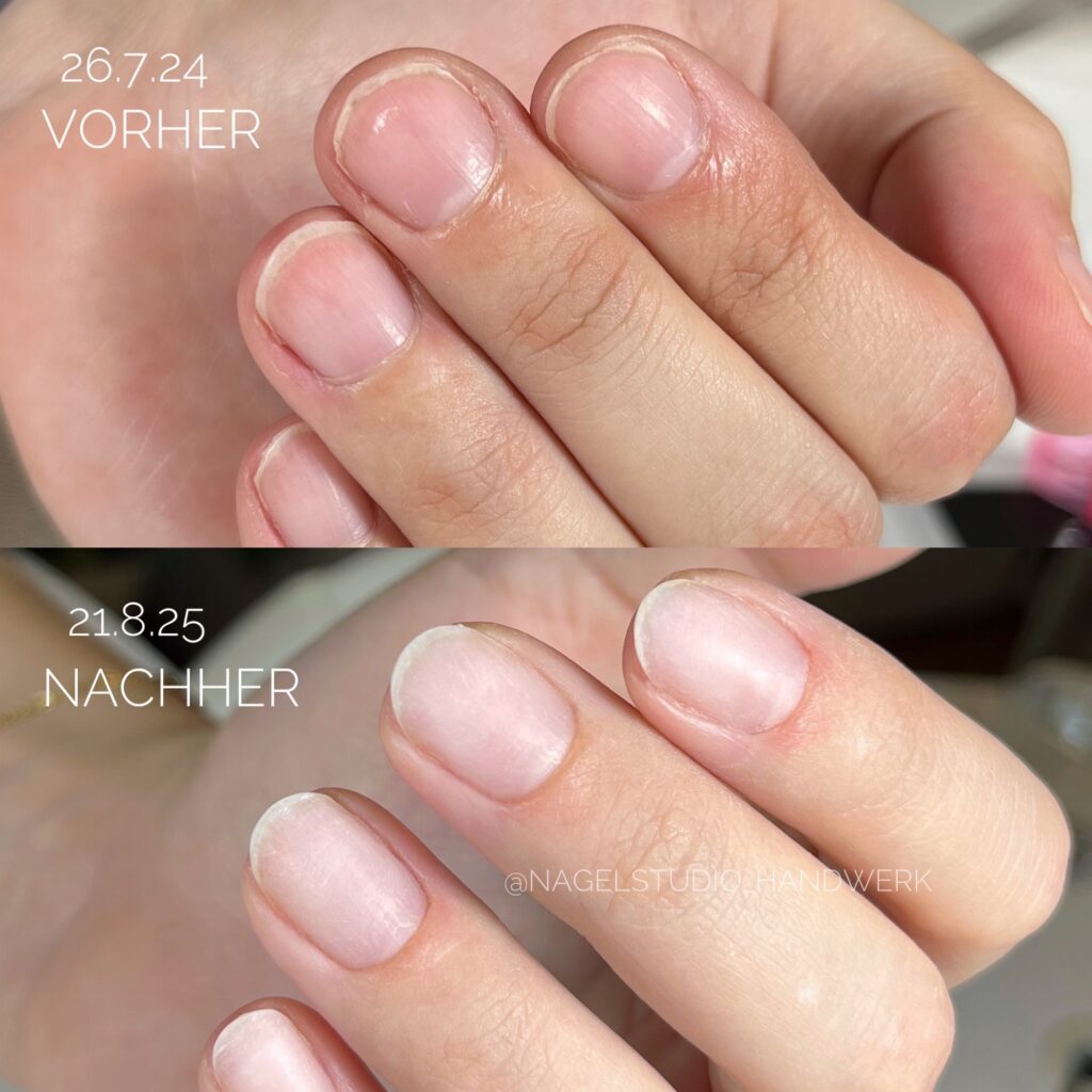 Diese Kundin wandte sich am 27. Januar mit anspruchsvollen Naturnägeln an mich – unter anderem mit trapezförmiger Form und einer beschädigten Seitenlinie am Zeigefinger. Nach wenigen Monaten fachkundiger Betreuung konnte sie am 8. August ein deutlich verbessertes Ergebnis genießen. Die Veränderung spricht für sich.